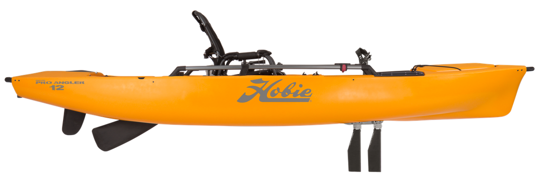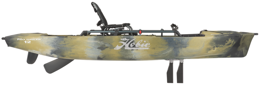 Experience full power reverse with the MirageDrive 180 with Kick-Up Turbo Fins. Logs, kelp? No problem. Our patented Kick-Up Fins “kick back” when contact is made with under water obstacles. Keep a half-dozen rods rigged and ready in the four standard horizontal and two molded-in rod holders for the ultimate kayak fishing adventure. Confidently stand and fire cast after cast. Equipped with the Guardian Transducer Shield, your transducer is protected on impact and retracts for transport, while providing side scanning for optimal fishfinder performance. The ultra comfortable, elevated Vantage ST seat makes it easy to stay out on the water all day and move around the boat. The Pro Angler 12 includes a retractable skeg for improved course-keeping, as well as the innovative 12-sided Hobie H-Rail for superior flexibility in accessory rigging.